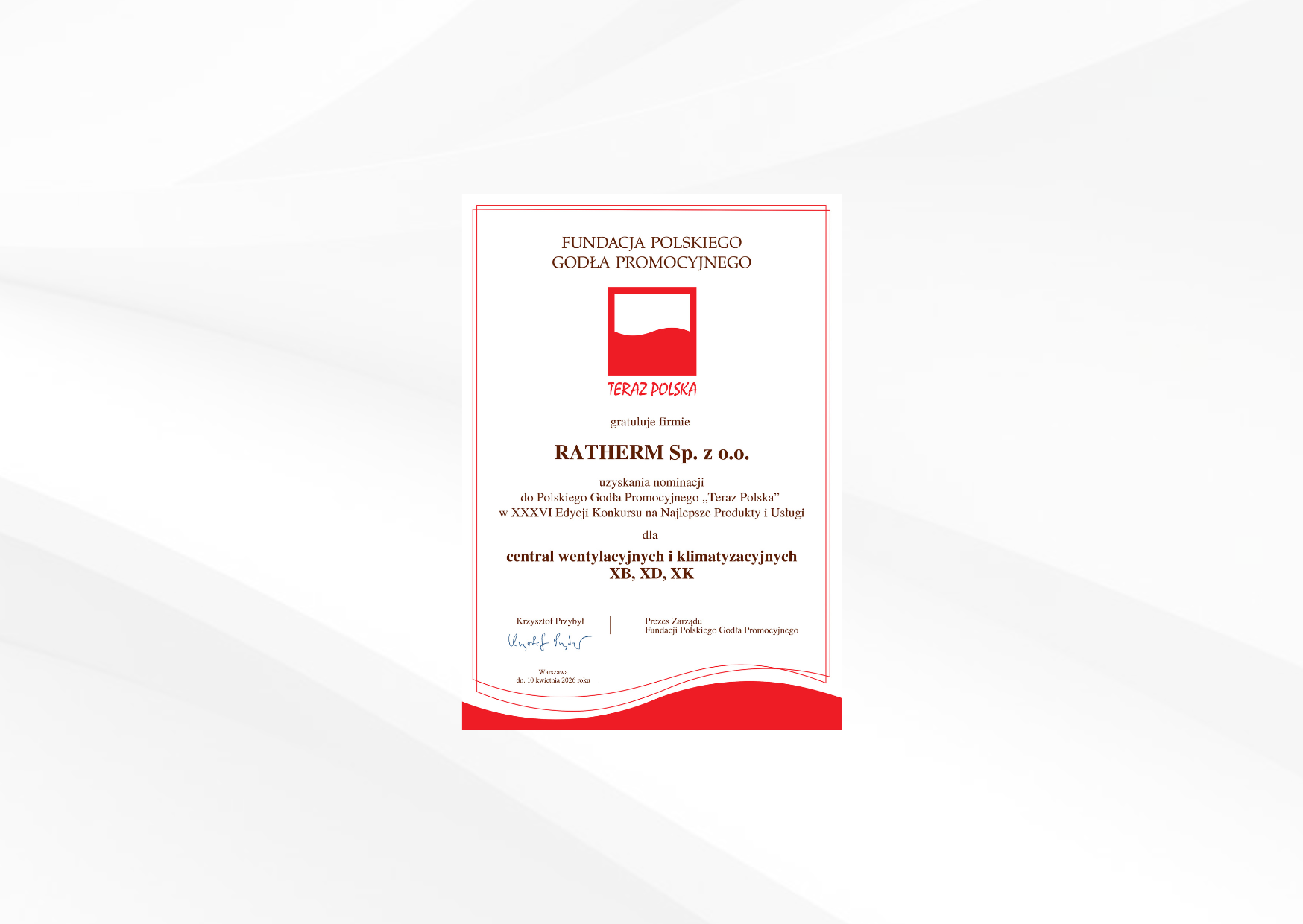 Z przyjemnością informujemy, że firma RATHERM Sp. z o.o. otrzymała nominację do Polskiego Godła Promocyjnego „Teraz Polska” w XXXVI edycji konkursu na Najlepsze Produkty i Usługi.