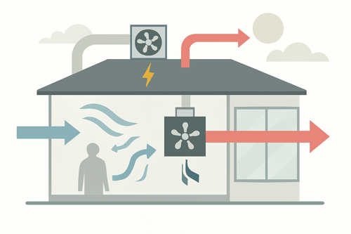 - Świeże powietrze jest dostarczane do wnętrza mechanicznie (wentylatorami), a jego odpływ odbywa się naturalnie przez nieszczelności (okna, drzwi). Taki układ jest często stosowany w biurach i budynkach użyteczności publicznej.