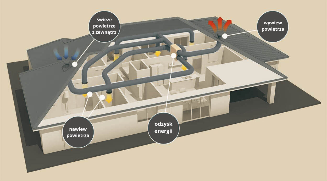 - Stała jakość powietrza – powietrze jest filtrowane, można je osuszać lub nawilżać, a odzysk ciepła z wywiewu ogranicza straty energii.